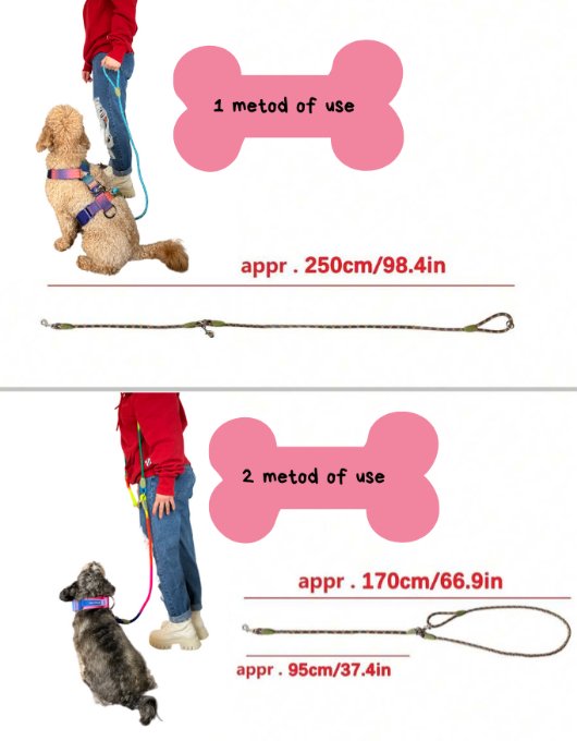 The reflective material adds safety and the leash can be used for small, medium, and large dogs. Its one size fits all design features a 250cm length and 1.2cm diameter for convenient use in various scenarios.